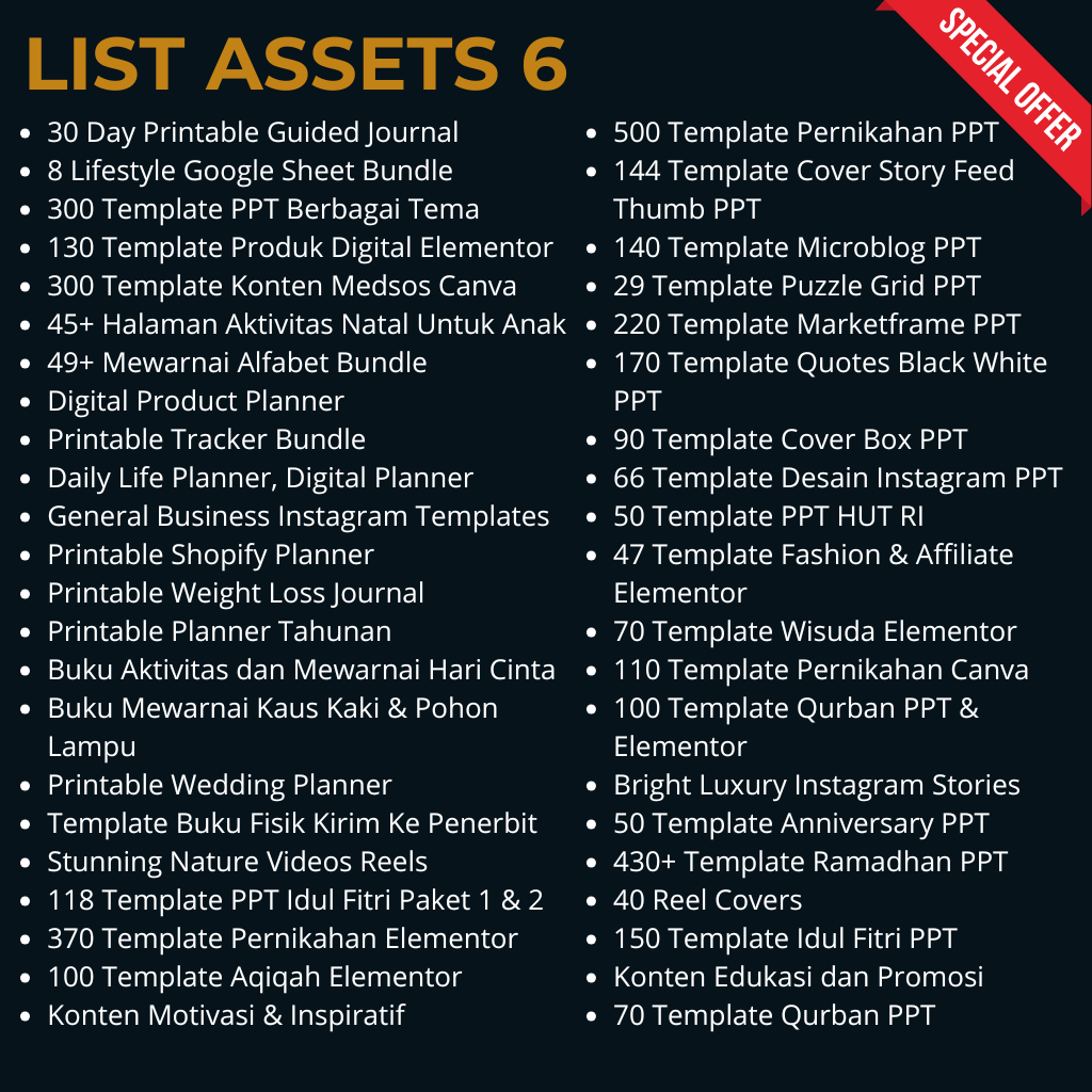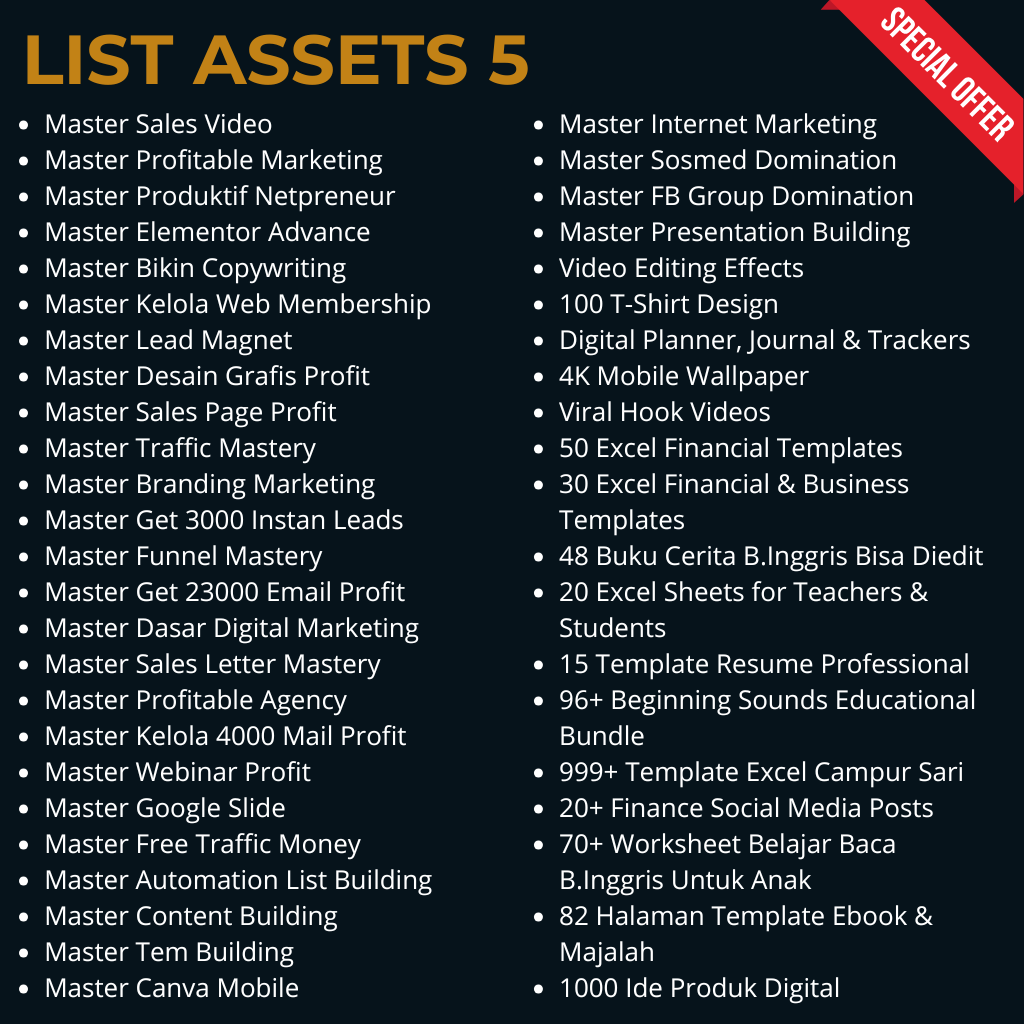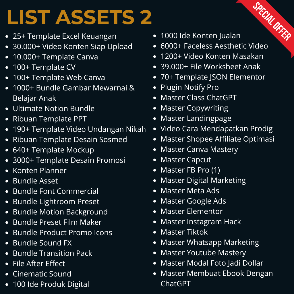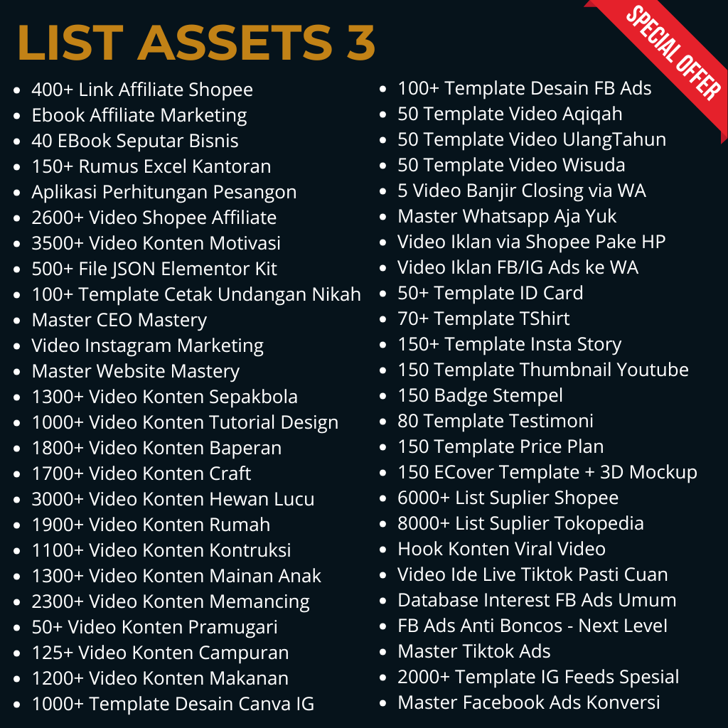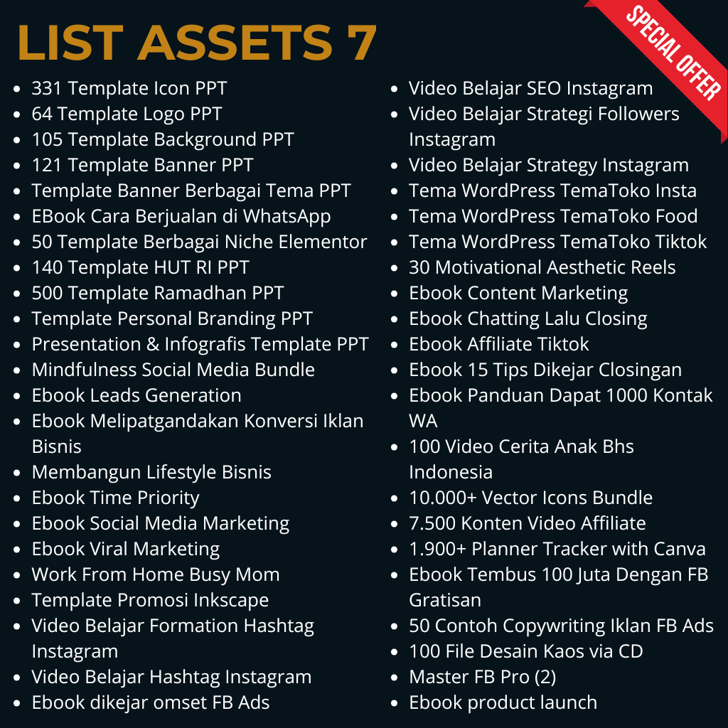 Kamu akan dapatkan banyak produk digital dengan berbagai kategori produk. Mulai dari Template Desain, Video template, Ecourse, EBook, Assets editing video, Plugin, Photoshop, Coreldraw, Office kit, konten video, faceless video, Hook Instagram, Meta Ads dan masih banyak lagi jenis produk digitalnya